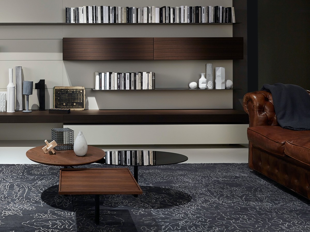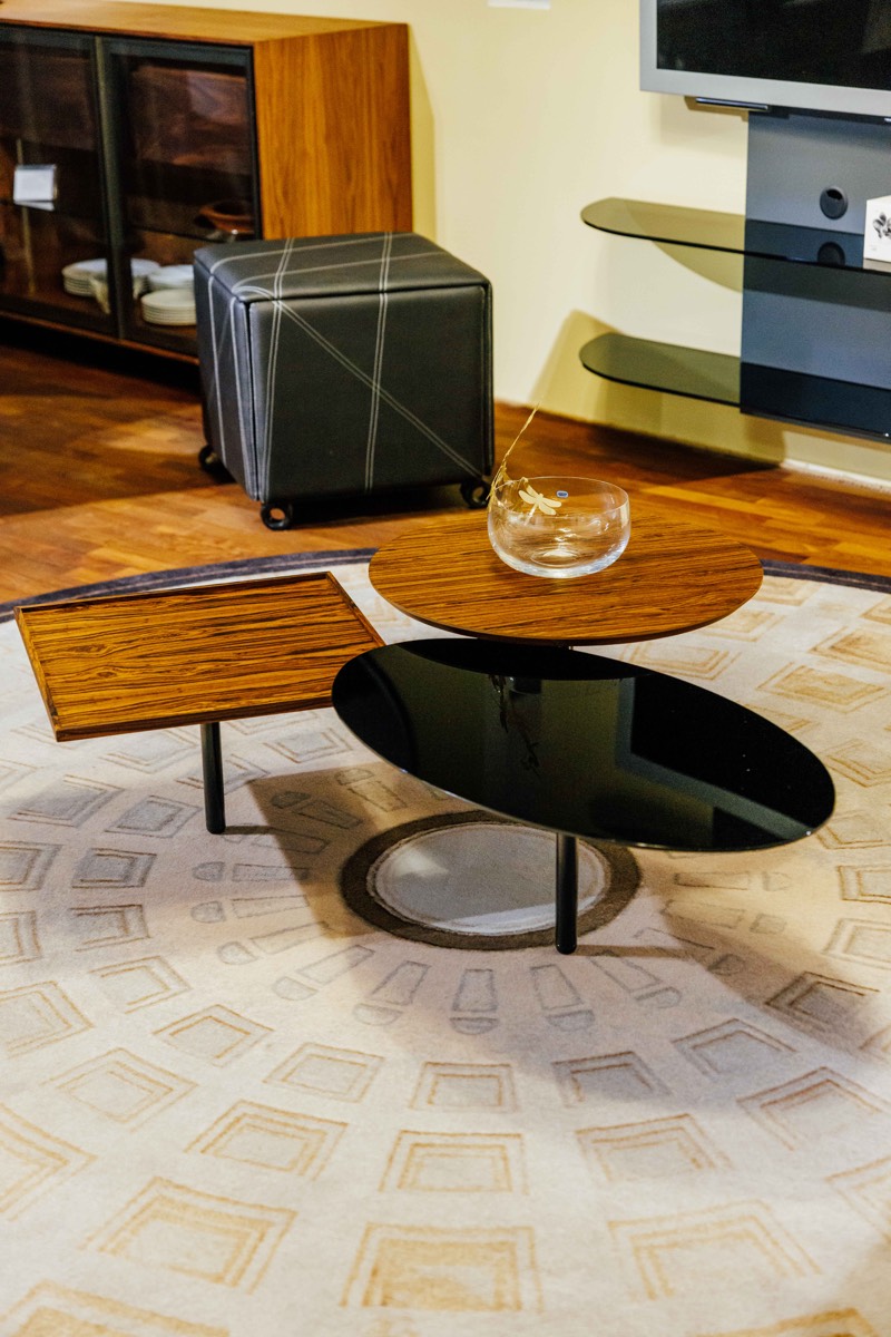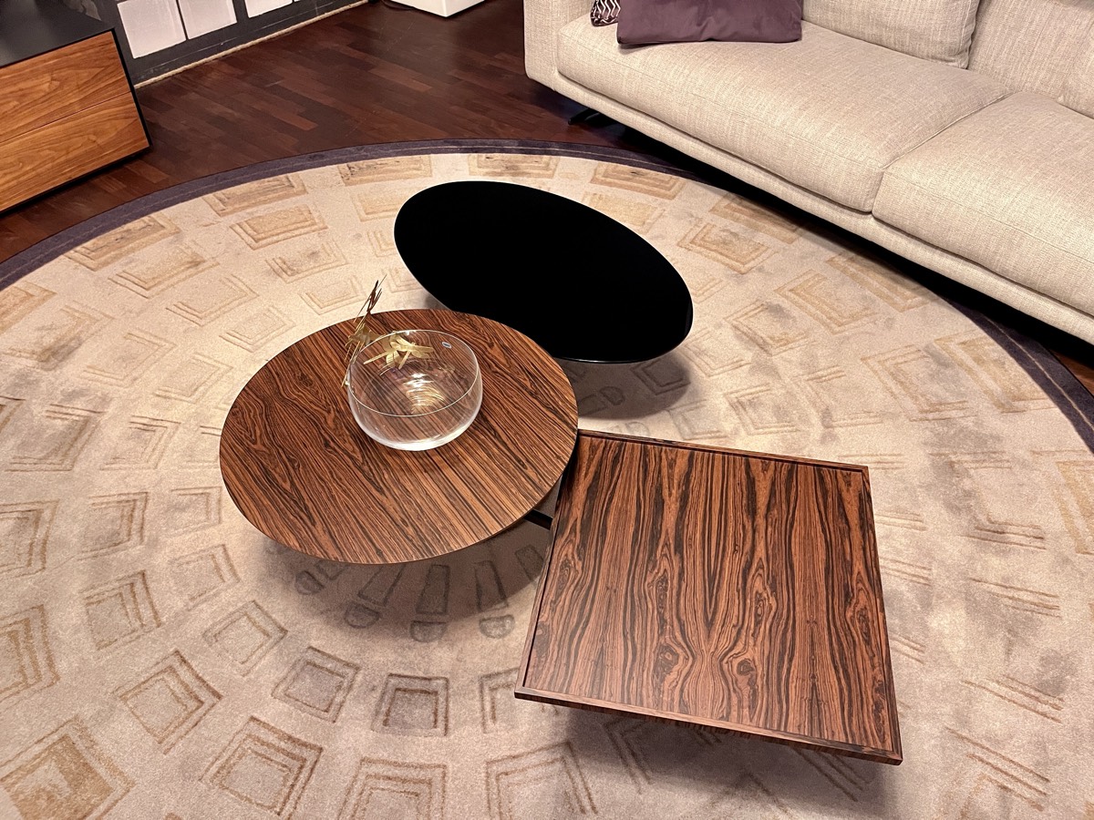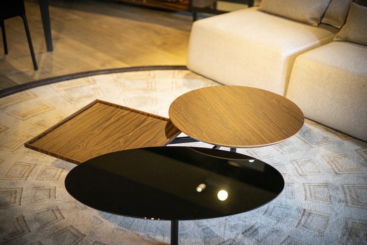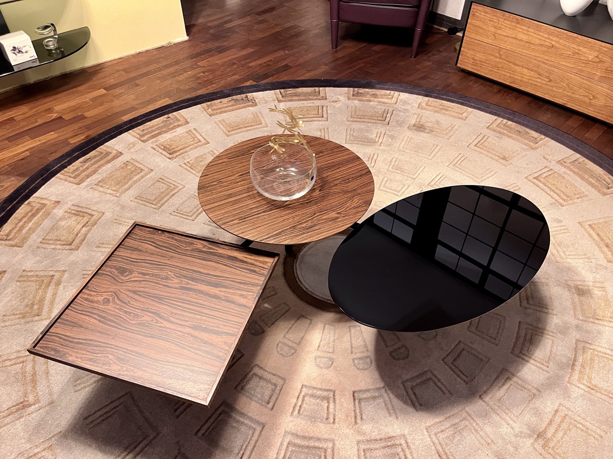 Colori e materiali | Gambe in metallo nero lucido, tavolino rotondo e quadrato in legno essenza lauro preto e uno ovale in cristallo retroverniciato nero. |