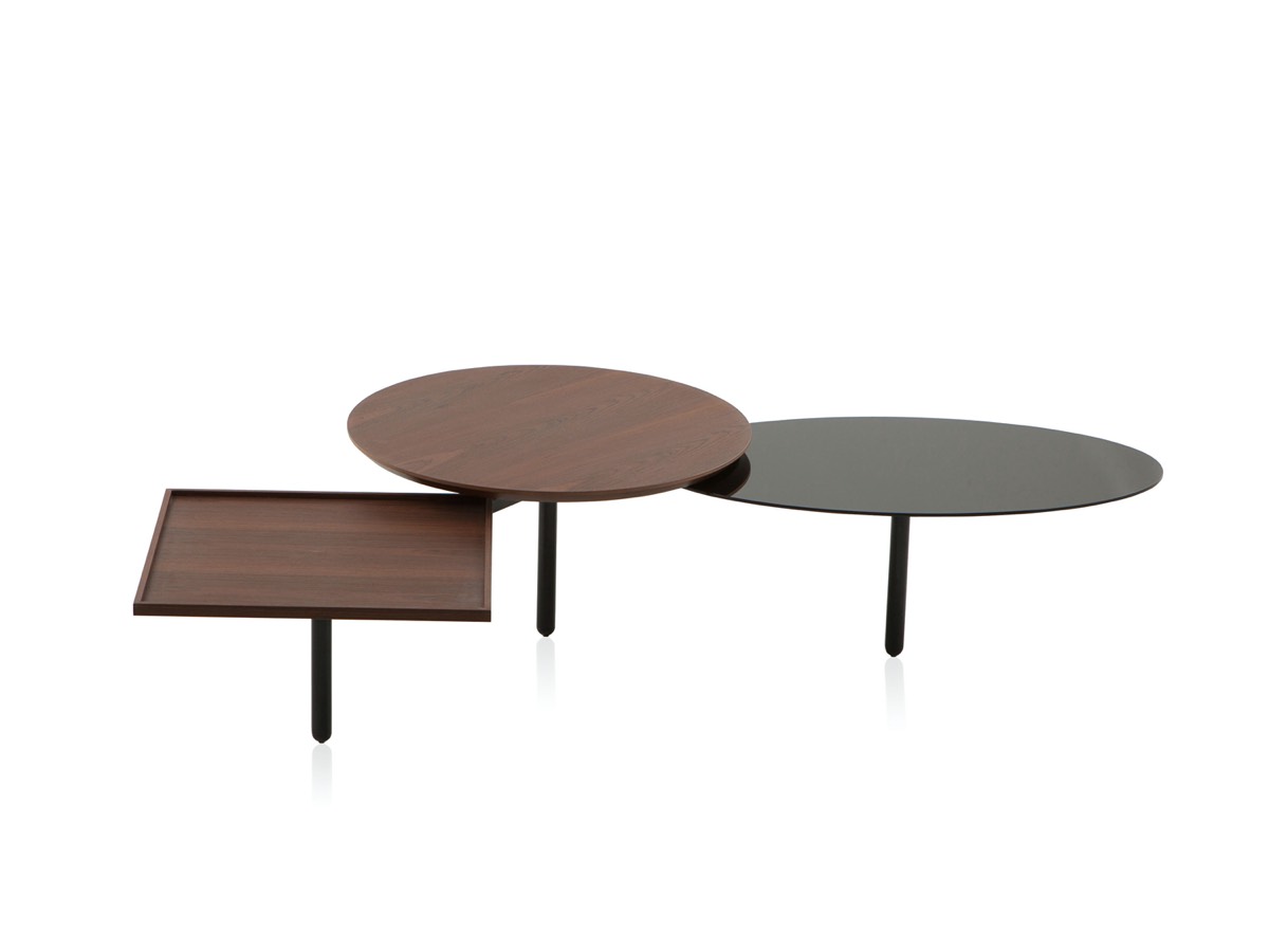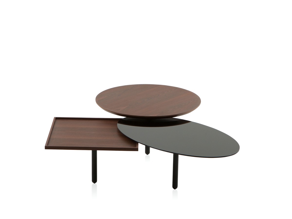 Descrizione prodotto | 3Table è un tavolino con gambe in metallo nero lucido, composto da tre piani: uno rotondo, uno quadrato in legno e uno ovale in vetro. Il movimento del tavolino è centrato sul piano rotondo, attorno al quale ruotano gli altri due, collegati tramite catene nascoste. Ogni piano può ruotare indipendentemente, facilitandone l'uso e la funzionalità. |